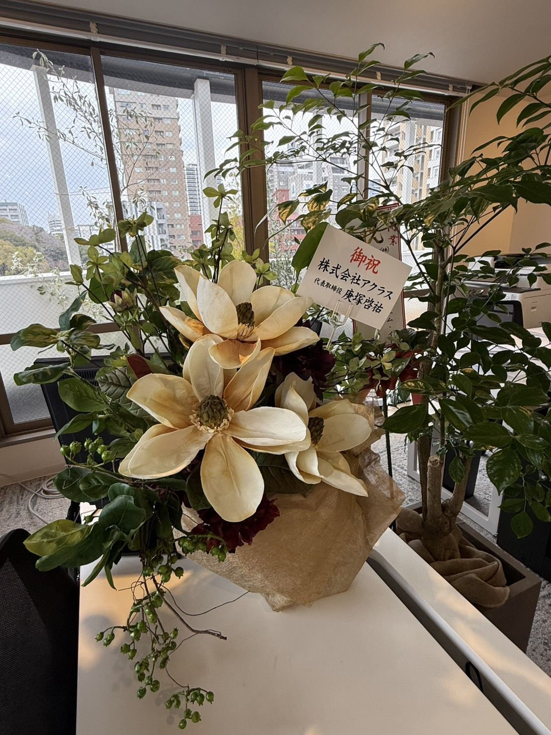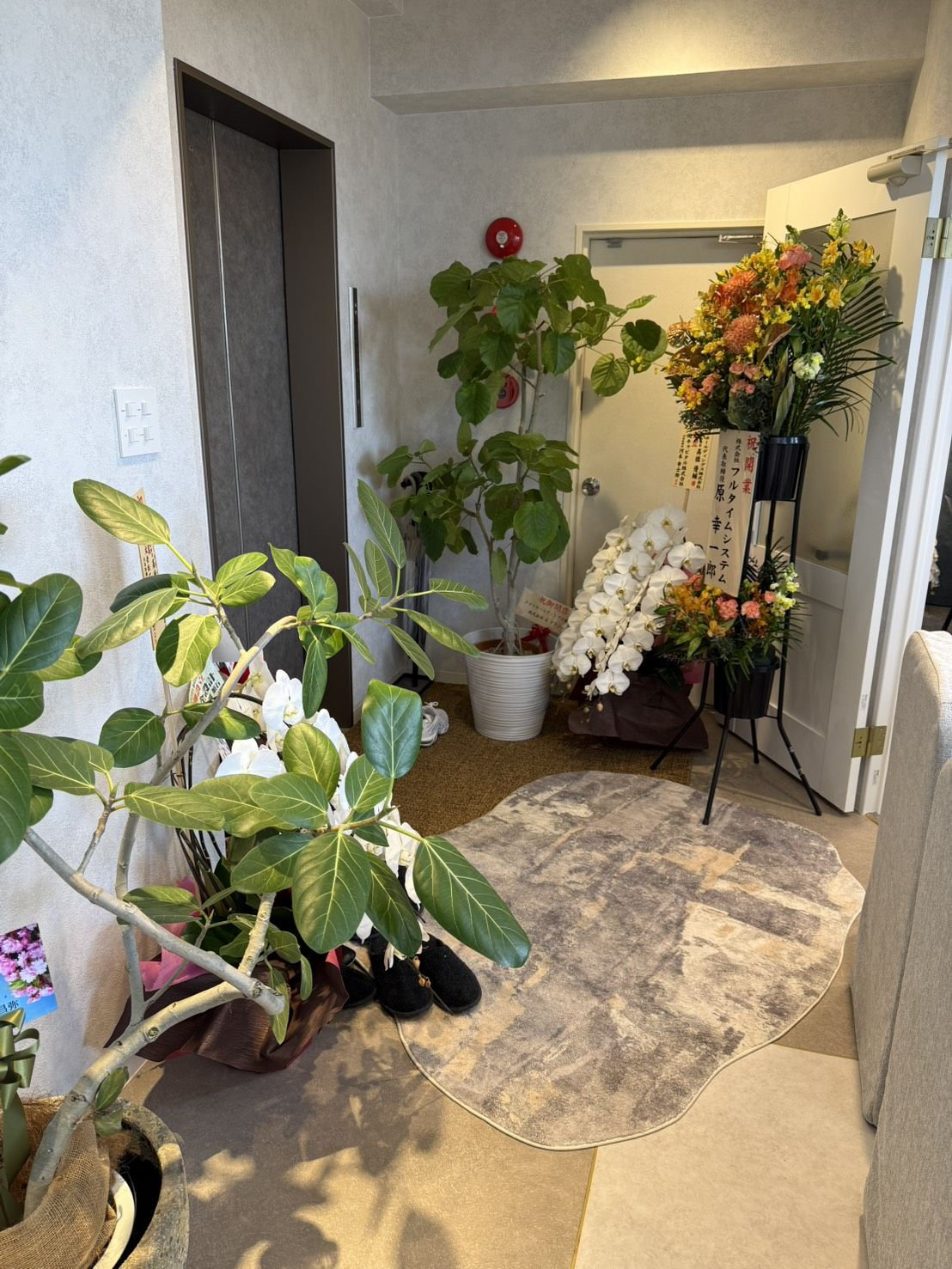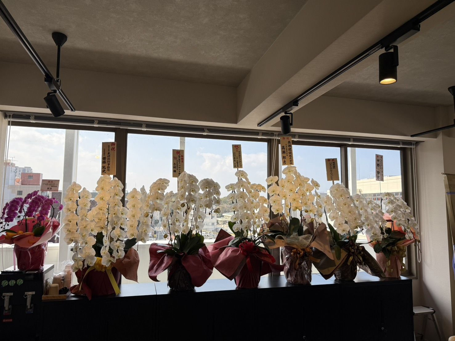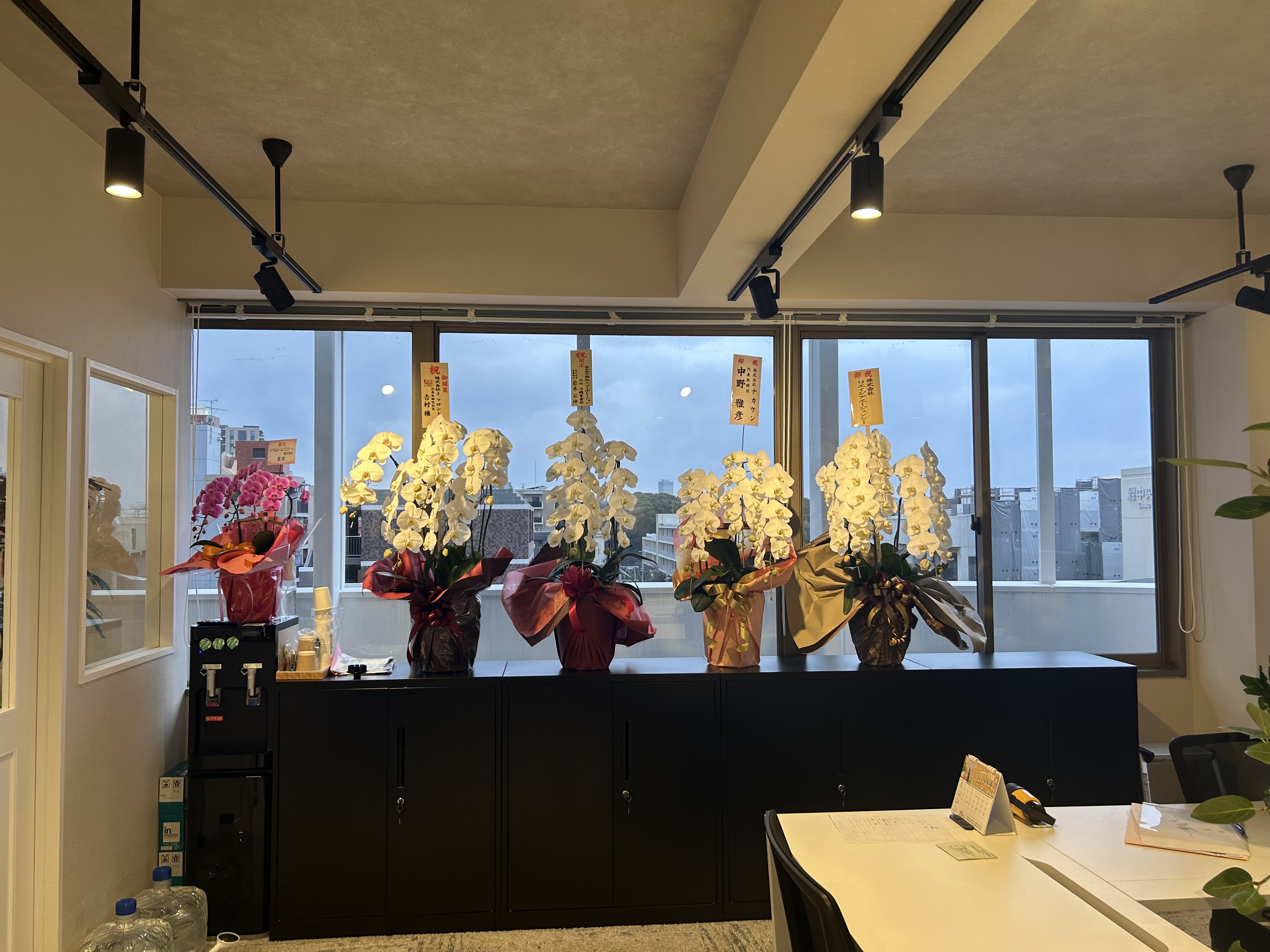 オフィスには、皆さまからいただいた色鮮やかなお花や心のこもったお品物が並び、新しい空間が非常に華やかで活気に満ち溢れております。