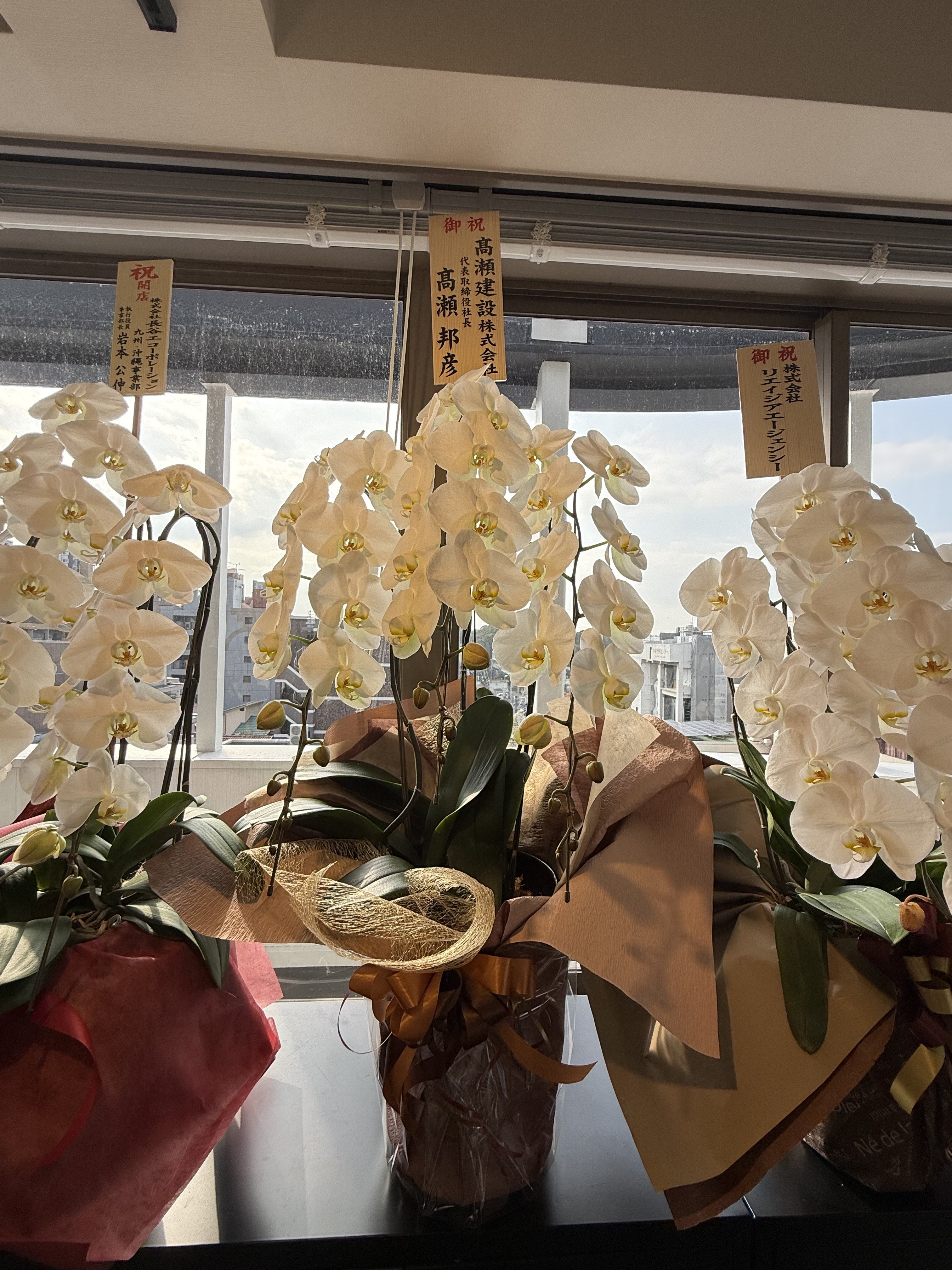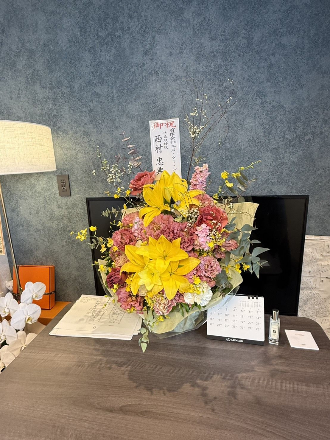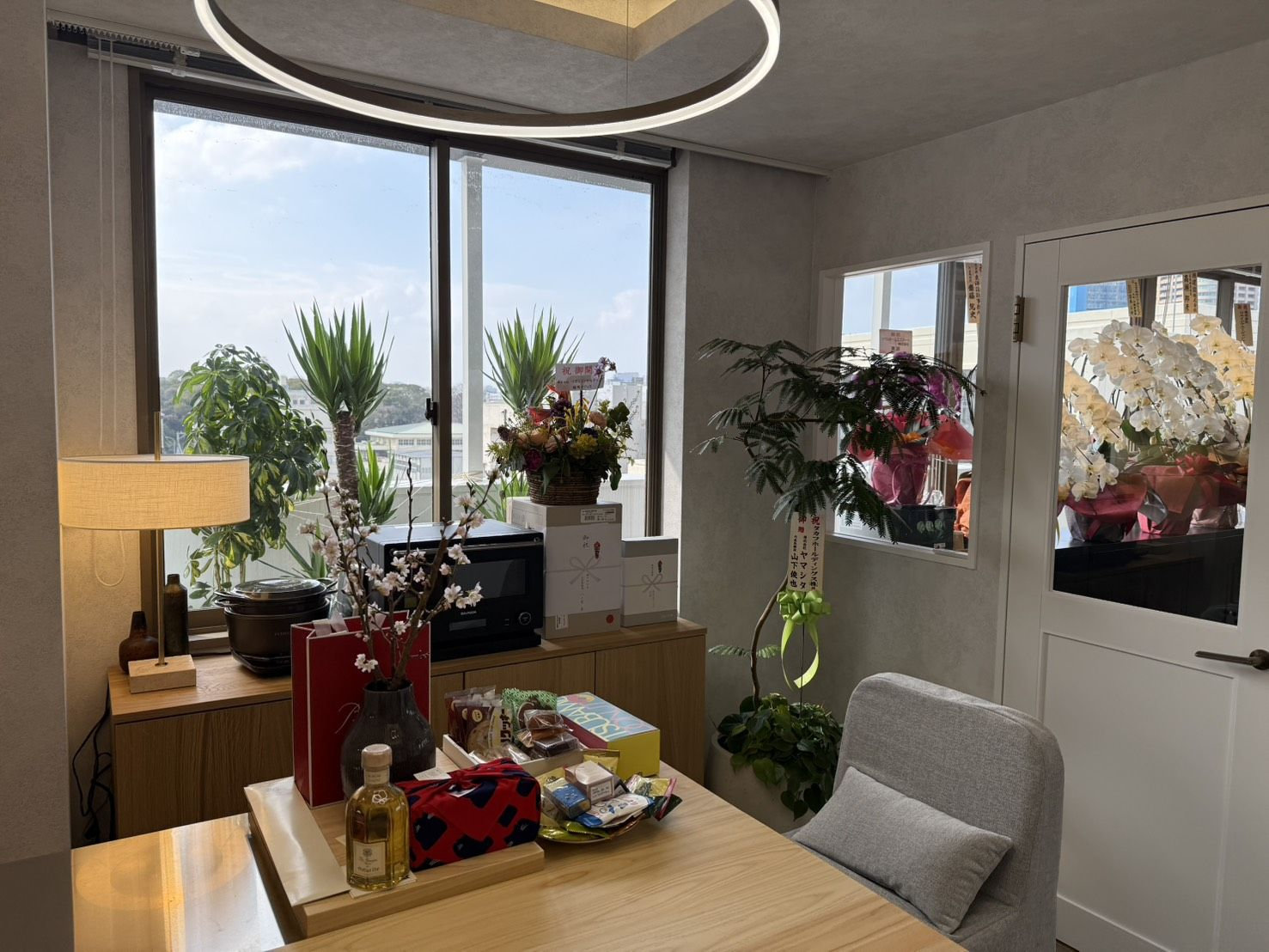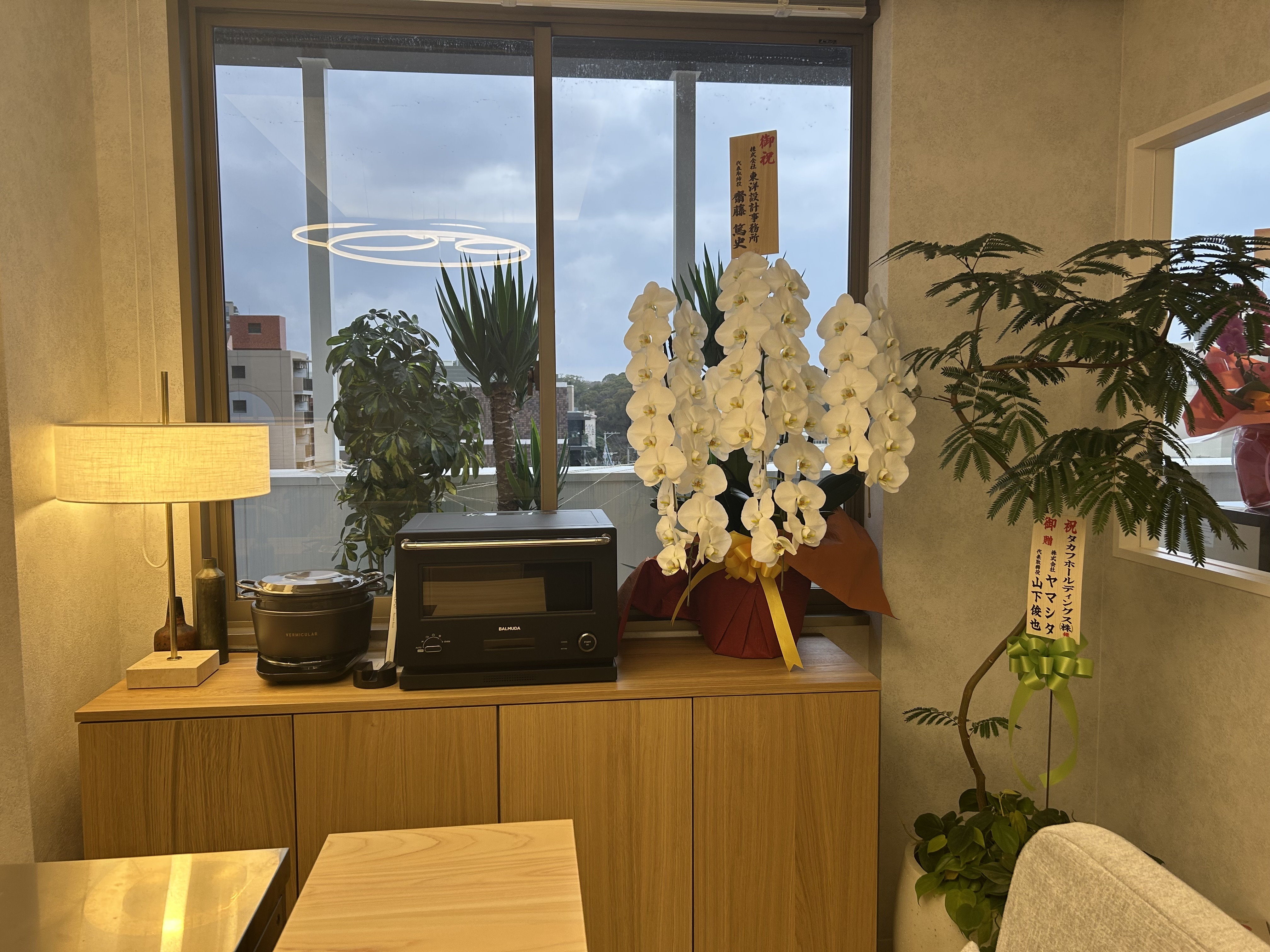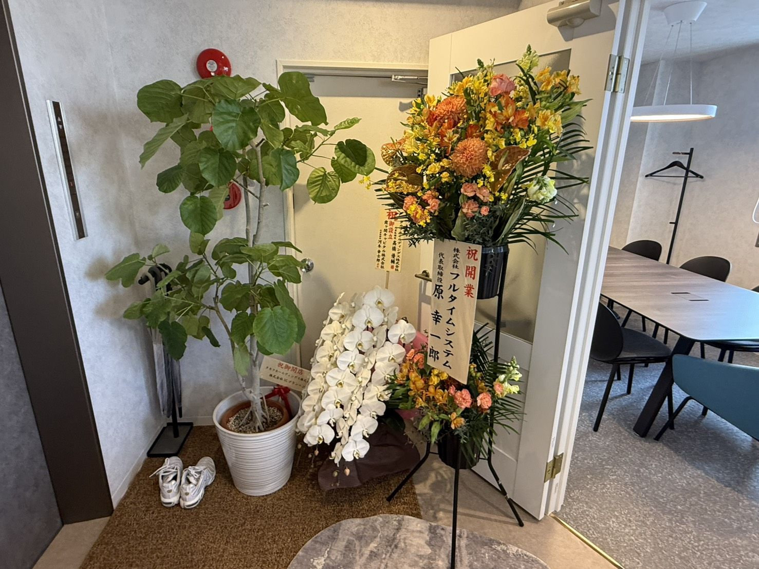 オフィスには、皆さまからいただいた色鮮やかなお花や心のこもったお品物が並び、新しい空間が非常に華やかで活気に満ち溢れております。